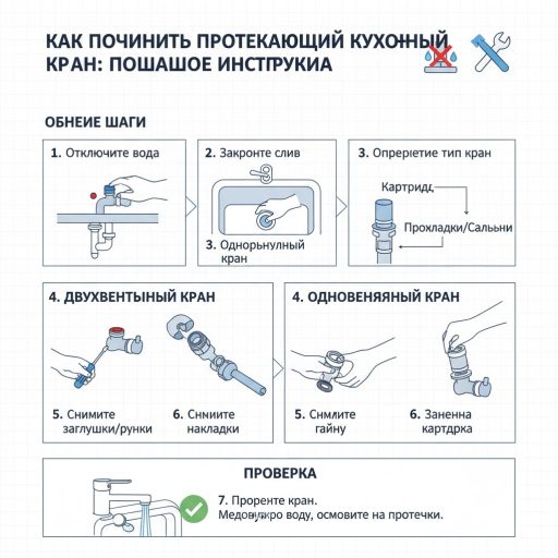 Как починить протекающий кран на кухне — подробная пошаговая инструкция Время на ремонт: от 20 минут до 2 часов (в зависимости от типа крана и поломки). Сложность: низкая/средняя. Автор: Мастер-советчик Обновлено: 12 ноября 2025 Содержание Почему течёт кран — причины Что нужно для ремонта Меры безопасности Пошаговая инструкция ремонта Типичные проблемы и решения Когда звать … Читать далее